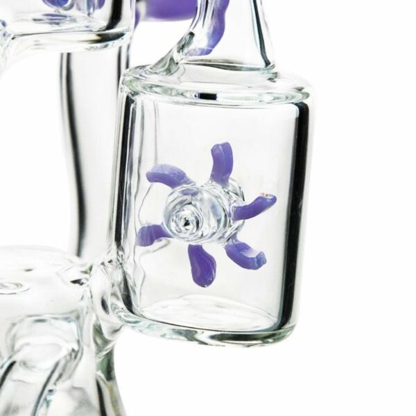 The Double Windmill Recycler is equipped with the first of its kind pirateβs helm percolator, named after its near resemblance to a shipβs steering wheel. After lighting the bowl, this unique perc housed within the base of the bong will effectively filter & diffuse your smoke through four separate paths submerged in water. Two windmill percs that spin simultaneously as you inhale are situated inside floating recycler chambers and create a whirlwind of smoke & water that works to further cool down each rip. The floating chambers are interconnected by a third recycling chamber at the top where your smoke reassembles before traveling up the bent neck mouthpiece. Any excess water that makes it to the uppermost chamber is then directed into the recycling tunnel on the back and down to the base.