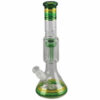 The CaliConnected Tree Perc Beaker Bong stands 12” inches tall and is made of thick borosilicate glass. It has a 14mm female joint and comes with a 14mm male bowl piece. This unique bong features colorful stripe accents, a triple-pinch ice catcher, and a 6-arm tree perc.