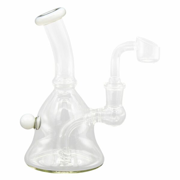 This handbell shaped water pipe will leave your head ringing! The Bell Base Dab Rig from CaliConnected was designed to pack a punch with every rip. Despite standing just 6.5β inches tall, the voluminous bell-shaped chamber can fit as much vapor as a water pipe twice its size! The bell base houses a fixed diffuser downstem in the center that filters your smoke through water for silky smooth hits. The wide bell shape also offers a sturdy base while your piece is tabled and features a worked glass marble on the backside that provides an unrivaled grip when in use. Whether youβre in the mood for wax or flower, this dab rig comes with a thick 14mm quartz banger nail and 14mm male bowl piece to have you covered in any session. Fire up the CaliConnected Handbell Dab Rig today and you wonβt bell-ieve how you survived so long without it!
