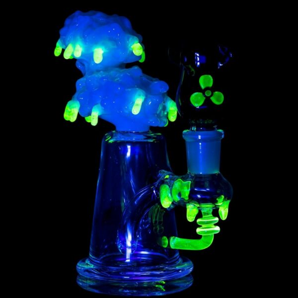Stay ahead of the post-apocalyptic trends with this highly reactive water pipe from Empire Glassworks. The Radioactive Cloud Bong is sure to leave a mark in your glass collection with its unique styling and a nuclear meltdown theme that includes radioactive acid drips and an atomic bomb shaped bowl piece. Featuring UV reactive “Illuminati” glass that shines bright when under black light, this mind-blowing Empire Glassworks 6” mini bong pipe is guaranteed to provide you with some bomb sessions.