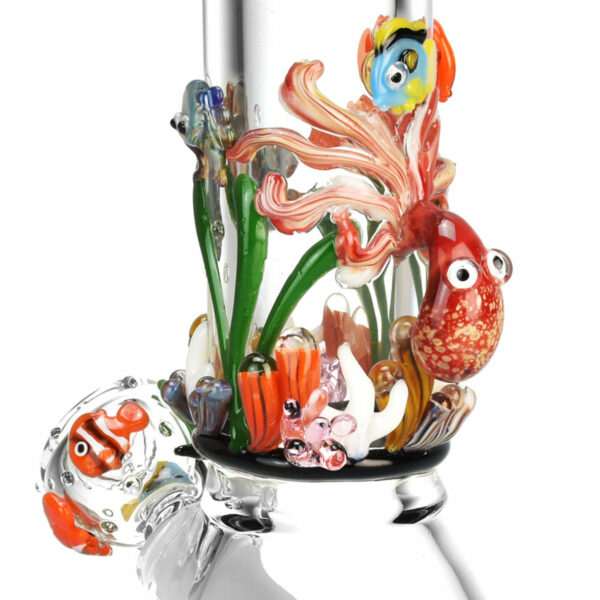 Empire Glassworks is making waves with its new line of Baby Beaker Bongs. The Under the Sea Baby Beaker Bong is a smaller version of the Under the Sea Beaker Bong and features eye-catching artwork that gives Empire its solid reputation. The Under the Sea Baby Beaker Bong is decorated with individually handmade, worked glass accents on the middle of the neck that highlight the Empire’s signature aquatic theme. This includes adorable fishies within a plethora of colorful deep-sea foliage and a large Kraken octopus that makes this entire water pipe come to life. It stands 8” inches tall and includes a 14mm Under the Sea Bowl Piece with a worked glass starfish, orange fish, and matching ocean vegetation. Get an aquatic mini beaker that rips with theΒ Under the Sea Baby Bong!