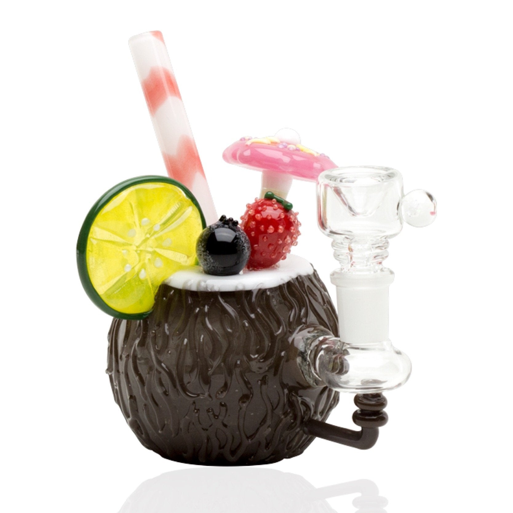 Empire Glassworks has put the lime in the coconut for you with this unique water pipe! The Coconut Colada Mini Bong expertly resembles a tropical coconut drink, complete with individually handcrafted glass accents including fresh fruit, a mini cocktail umbrella, and of course a lime garnish worked right into the glass. Each Coconut Colada Mini Bong is made from thick borosilicate glass and custom mixed colors, including a fuzzy-brown colored body that looks just like the real thing! A reinforced 14mm female joint leads each hit from the included bowl piece into a fixed diffuser downstem within the base of the coconut. This percolator effectively filters your smoke through water for cool, refreshing rips as you draw from the red and white straw-style mouthpiece.