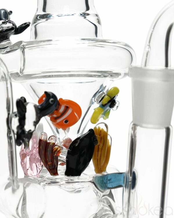 Every piece from Empire Glassworks is hand crafted and it really shows with pieces like the East Australian Current Recycler. The attention to detail in the artwork shines without sacrificing on function. It features a straight tube design with recycling function to constantly filter your water for smoother rips. This dab rig is complete with an Empire Glassworks bucket banger, sandblasted logo, matching terp beads and matching carb cap.