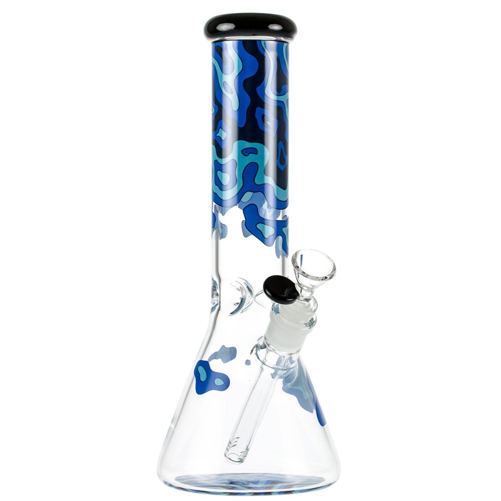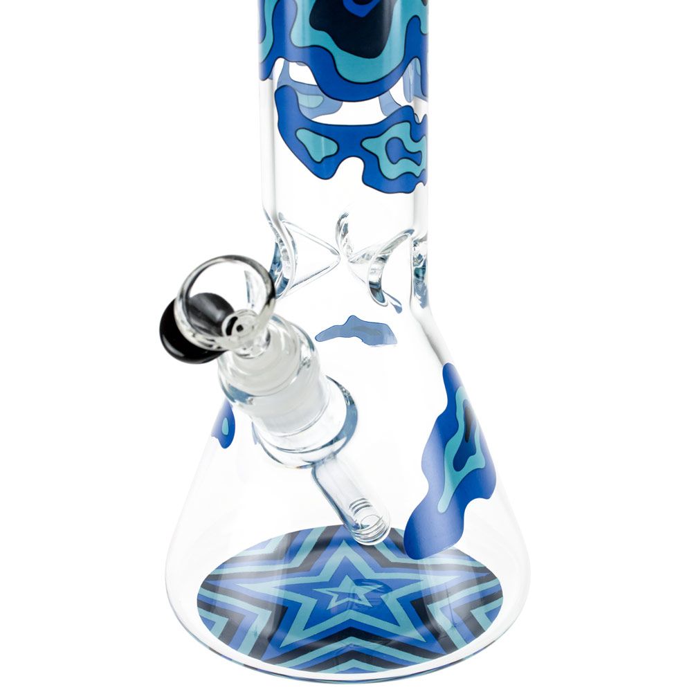 The Famous Designs Fabric Beaker Bong is made from thick borosilicate glass and measures 12” inches tall. The downstem is removable for hassle-free cleaning and features a 14mm female joint that holds an included 14mm funnel bowl piece. This thick glass bowl piece is complete with a matching black glass handle that provides an easy grip while lifting the bowl each hit and doubles as an effective roll stop when tabled. The Famous Brandz Fabric Water Pipe is delivered in a matching blue camouflage collectors box that is reusable for safe storage. Colorful, unique, and built to last, the Famous Designs Fabric Beaker Bong is a true no-brainer for anyone seeking their next budget-friendly glass water pipe.