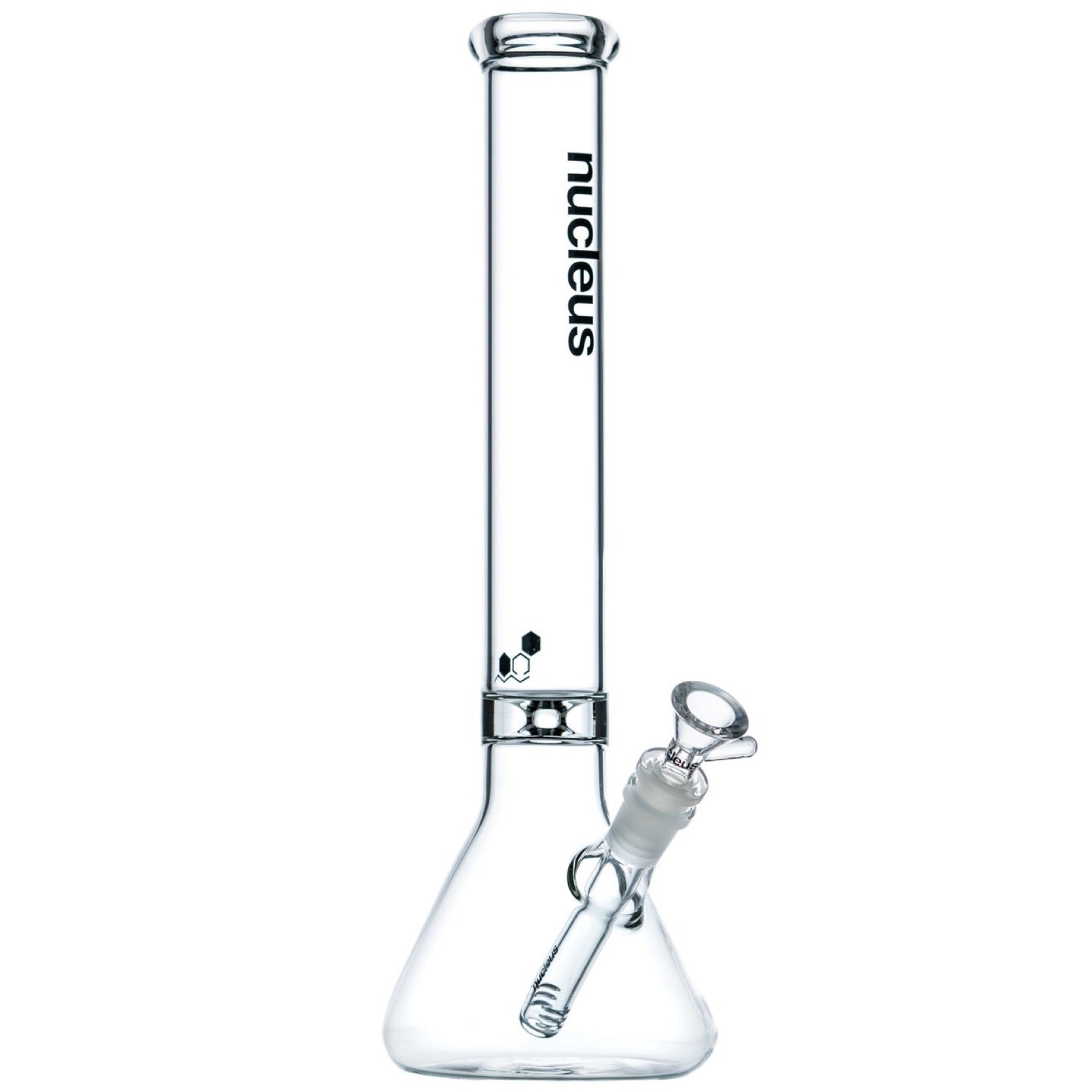 The Nucleus 14” Beaker Bong features a super sleek clear glass body that encapsulates the ideal scientific glass look. A voluminous beaker bottom base houses a 3.5” removable diffuser downstem that will effectively filter your smoke through water. Equipped with a donut style ash catcher above the beaker base, this Nucleus Glass Bong is primed and ready for icy cold rips from the included 14mm glass bowl piece. The Nucleus 14” Donut Ice Catcher Beaker Bong is made from thick borosilicate glass built to last, accented with a colored Nucleus logo and decals on the straight neck and downstem. A flared mouthpiece make this piece easy to handle and the simple design makes this bong easy to maintain & keep clean. At an unbelievable price that won’t make you hesitate, grab this cheap Nucleus Glass Beaker Bong today before they’re all gone!