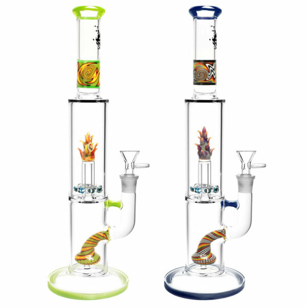 A hit from the Spiral Space Glow Bong will draw you into a new dimension filled with unique spiraling colors and a frenzy of smoke & bubbles. Pulsar never fails to impress and created this 15” inch tall bong for those who like a little flare and a lot of smoke to go with it. The awesome design of the Spiral Space Glow Bong was given as much thought as its incredible functionality. After lighting up, your smoke travels down into the waterspout percolator, which filters smoke through multiple slits to create cooler hits inside the base. The second round of filtration occurs in the middle chamber just beneath the spiky superterrestrial plant perched atop the showerhead percolator. The Spiral Space Glow Bong sports a unique showerhead perc accented with colorful glass beads around the perimeter that expertly diffuses your smoke through water. This thick borosilicate glass bong, which comes in your choice of various color schemes, has an 18mm female joint and includes a matching 18mm male bowl piece with a worked glass handle. Get the Pulsar Spiral Space Glow Bong and enjoy an out of this world experience every smoke session!