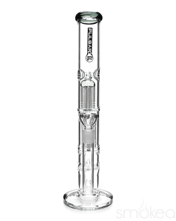 Talk about a water pipe that packs a punch. That’s right, we’re talking about the Dual Jellyfish Straight Tube Bong from Pulsar. The dual jellyfish percolators (also known as tree percolators) in combination with the honeycomb perc provides for extremely smooth smoke every time. The straight tube measuring 16.5″ in height means you can build up a ton of smoke to enjoy some of the biggest, smoothest hits around. To top it off, this piece features a built in ice catcher so you can make those super big hits super chilled. The 90-degree joint (banger hanger) means you can simply add a domeless nail or banger to convert this beast to a hard-hitting dab rig. Made of high quality borosilicate glass and available in several colors.