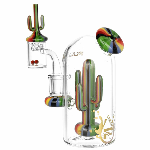 Discover the allure of the desert with the Pulsar Desert Mirage Dab Rig Set, a comprehensive and stylish kit designed for an enhanced dabbing experience. This set is meticulously crafted from high-quality borosilicate glass, known for its durability and heat resistance, ensuring longevity and pure flavor. The mini rig, standing at 5.5”  inches tall, features a dome-shaped chamber that houses an intricately designed saguaro cactus disc percolator.