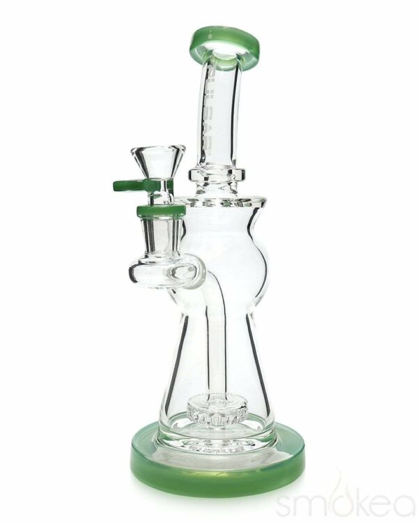 This elegant bong from Pulsar stands 8.5″ in height and provides pleasant water filtration due to it’s built in disc percolator. It’s stemless design offers an easy to clean design with less parts. The included 14mm dry herb bowl features color accents along with the bong’s mouthpiece and base. The bent mouthpiece provides for a comfortable smoking experience. A thick, wide base provides stability for the bong to prevent accidental drops. The 90-degree banger hanger joint makes it a perfect water pipe to convert into a dab rig for use with extracts – just add your own banger. Available in several colors.