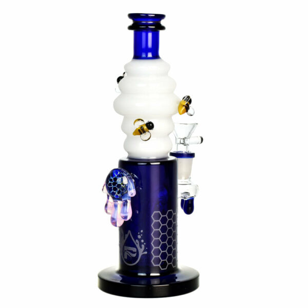 The Pulsar Killa Bees Water Pipe features a chamber bongΒ design with a beehive neck and honeycomb pattern decal. Bold colors and decorative exterior bees and drip marble make this pipe a delight for admiring as well as smoking. StandingΒ 9.5β inches tall, this glass pipe is the perfect size for large and flavorful rips of your herb. This bong is made from quality borosilicate glass and includes a 14mm male bowl slideΒ to fit inside the 14mm female joint.