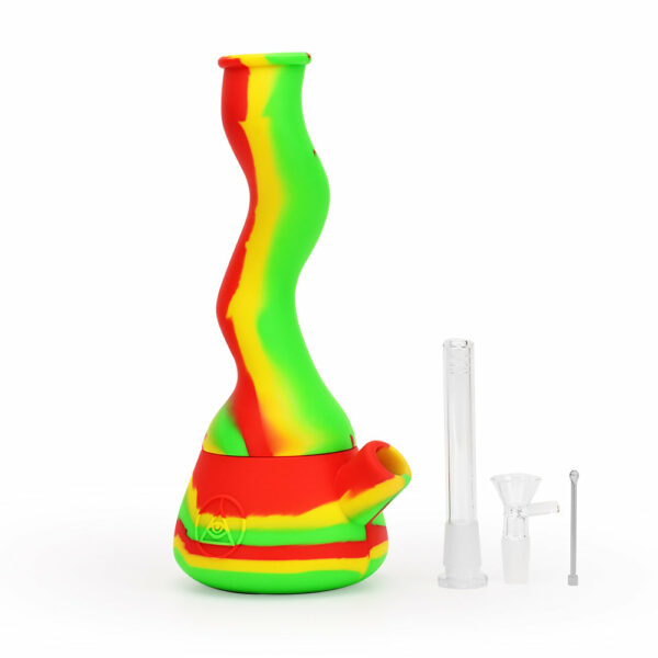 This beaker bong is made from platinum-cured silicone, a type of man-made polymer known for its durability and flexibility. This material choice makes the bong nearly indestructible, capable of withstanding significant pressure and force without losing its shape. This resilience makes it a perfect choice for even the most rugged use. Additionally, the bong features a unique wavy neck and comes in a variety of colors, adding a touch of personal style to its functional design. The inclusion of a cooling diffused downstem perc ensures that each hit is smooth and filtered, enhancing the overall quality of the smoking experience.