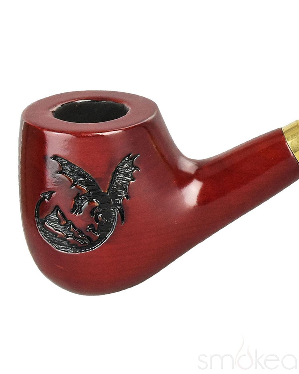 The Smaug Pipe is a churchwarden style hand pipe that features a long mortise and tenon stem connection. Constructed from high quality cherry wood and featuring a Smaug engraving on the side of the bowl.