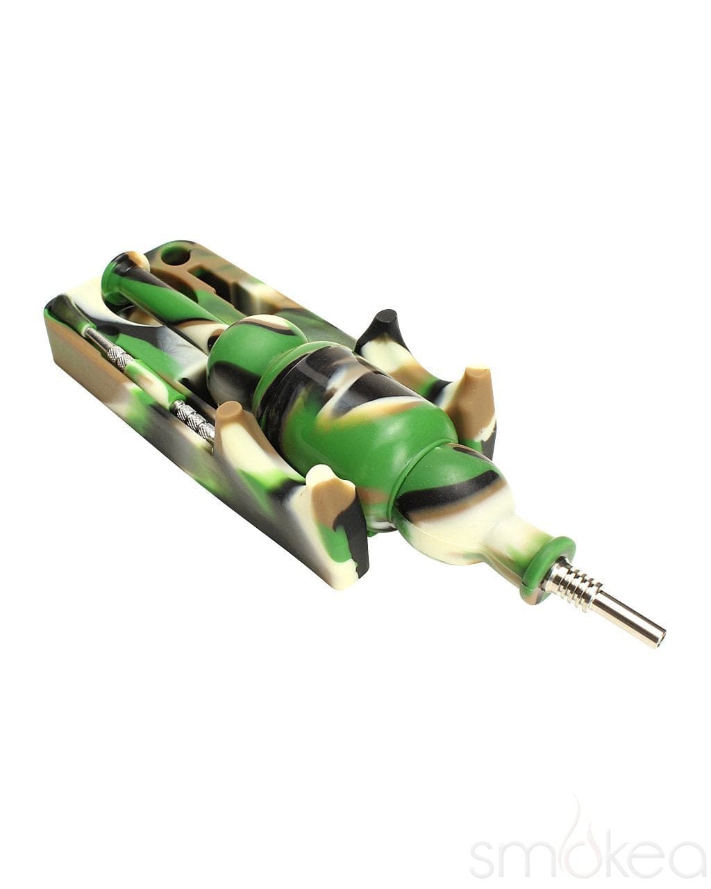 Introducing the world’s first ever silicone dab straw rig; the SiliNecatar. The SilicNectar is just as functional as glass collectors that are priced at hundreds of dollars, with the added benefit of being nearly indestructible. The SiliNectar can bend and fold for even more compatibility without the worry of dropping and shattering it. The SiliNectar includes a matching docking station, silicone tool and titanium nail.