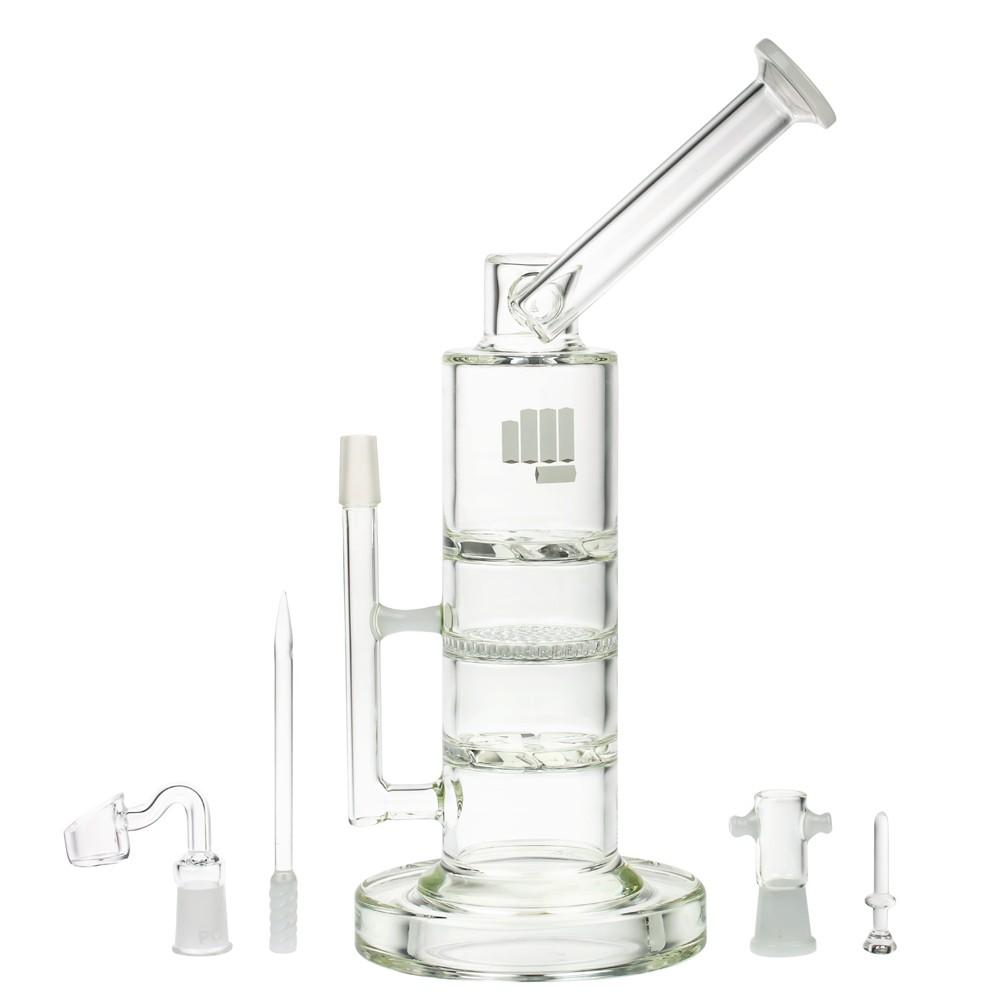 Travel into deep space with the Battleship Rig! Part of the Smoking Pounds lineup designed by Snoop Dogg in collaboration with Famous Brandz, the Battleship Water Pipe was devised from the ground up for a glass bong that is both highly functional and exceptionally stylish. The Snoop Dogg Pounds Battleship Water Pipe measures 12.5β inches tall from the flared base to the top of the sidecar neck mouthpiece. This premium hand-blown design uses triple stacked honeycomb turbine percolators within the main chamber to diffuse smoke three-fold for remarkably smooth hits. The body is handcrafted from the highest quality borosilicate glass available, with 5mm thick glass walls and an extra thick base to ensure your investment stays stable between uses. Compatible with both dry herbs and wax concentrates, the Snoop Dogg Pounds Battleship comes stacked with all the accessories you’ll need including a 14mm quartz banger bucket, 14mm vapor dome & glass nail, glass dabber tool, and TWO 14mm dry herb bowl pieces so you’ll always have a spare on deck.Β